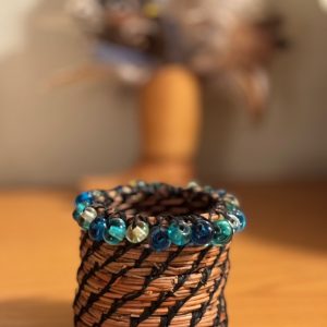 Pine needle basket with mixed blue lampworked beads medium size approximately 3″ x 3”, all basket are hand crafted and unique in size and look