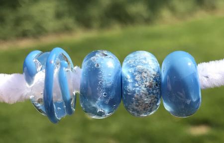 Solid, Lightest of the Egyptian blue, like French blue, viewing beads= far left bead shows color over clear, next is hair infused, next ash infused, far right is plain