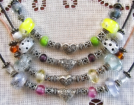 Adjustable 22″ 1.5mm leather, single strand featuring 2 handmade horse hair infused glass (ROX) beads, 4 handmade (wink) beads and 12 (chills) accent beads and 1 heart shaped charm. $45