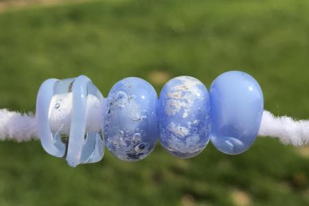 clear, light Periwinkle color, viewing beads= far left bead shows color over clear, next is hair infused, next ash infused, far right is plain