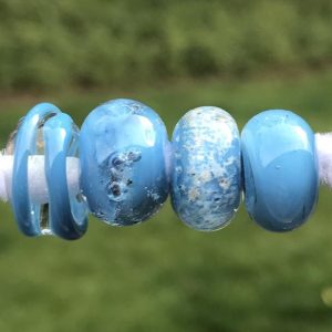 *December – Turquoise, Darkest of the clear Turquoise, viewing beads= far left bead shows color over clear, next is hair infused, next ash infused, far right is plain